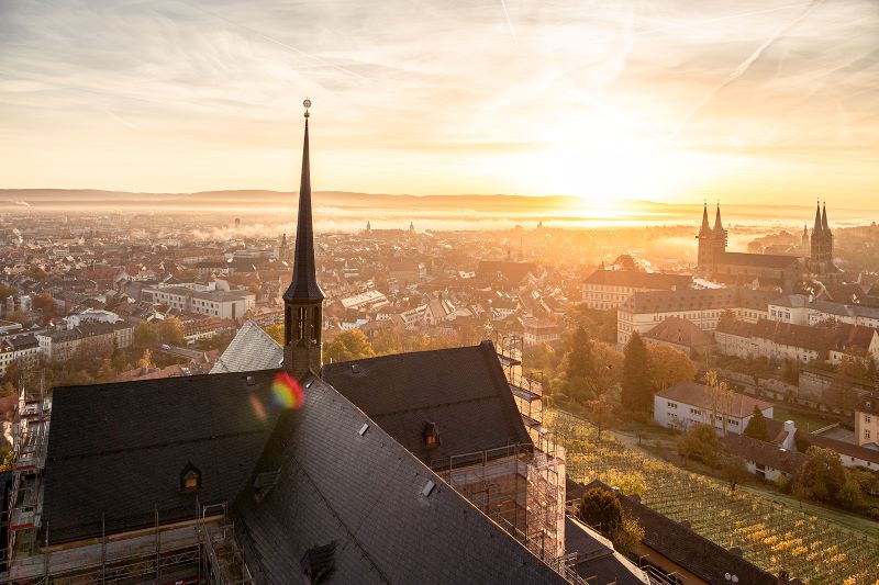 Hoch über den Dächern der Stadt, auf einem der sieben Hügel Bambergs, liegt die Klosteranlage St. Michael. Das ehemalige Benediktinerkloster auf dem gleichnamigen Michaelsberg prägt das Stadtbild der UNESCO-Welterbestadt seit Jahrhunderten und wird im Jahr 2026 in Bamberg für besondere Aufmerksamkeit sorgen. Denn nach 15 Jahren aufwendiger Generalsanierung ist die Kirche ab Mai kommenden Jahres wieder für Besucherinnen und Besucher geöffnet.
